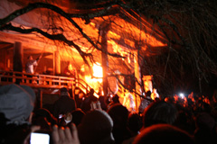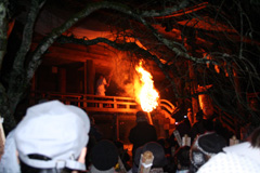 神宮寺本堂の回廊から装束の僧が大松明(たいまつ)を左右に振りかざす達陀(だったん)の行 | ||