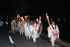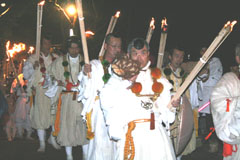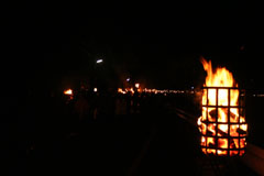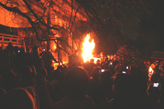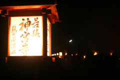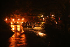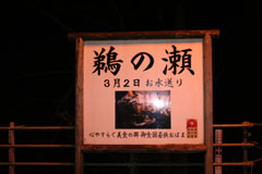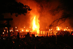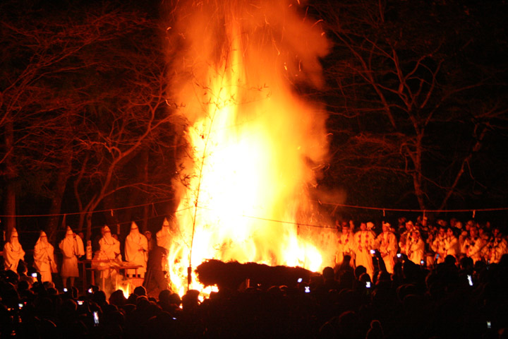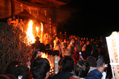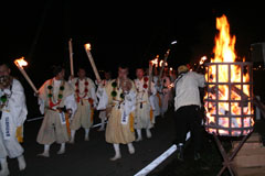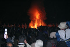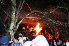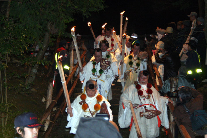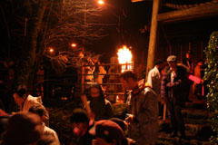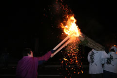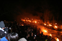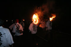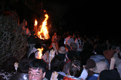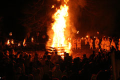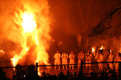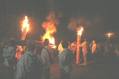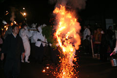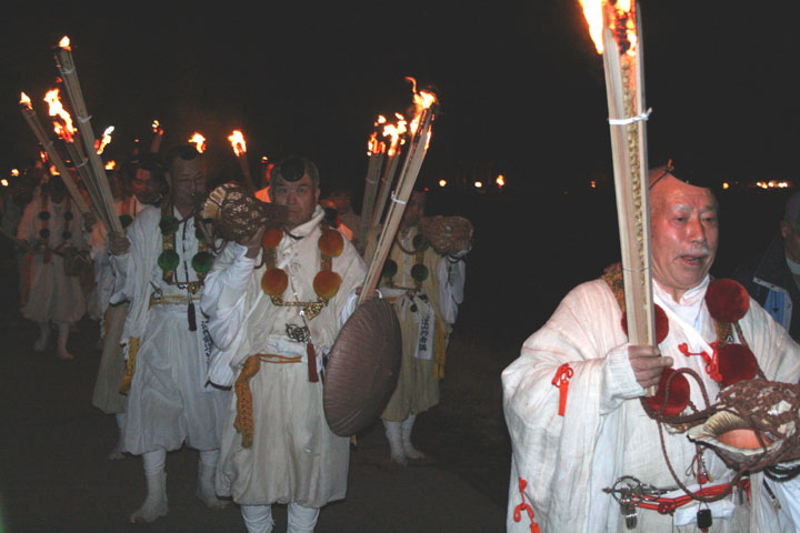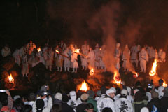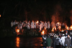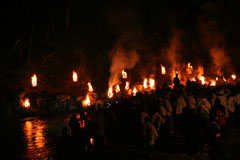 大護摩(ごま)に火が焚(た)かれます。そして、山伏(やまぶし)姿の行者や白装束の僧侶らを先頭に、大護摩からもらいうけた火を手に、4千人ほどの松明行列が、1.8Km上流の鵜の瀬へ向かいます。 | ||