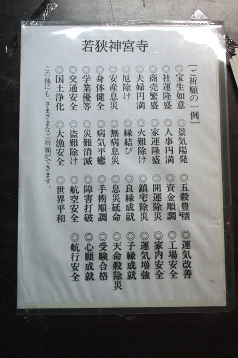 和銅(わどう)7年(714)白石明神直系の「和の朝臣・赤麿(あかまろ)」が神願寺を建立し、遠敷明神(おにゅうみょうじん)をまつったのが神宮寺の始まりです。 東大寺を開山した良弁(ろうべん)僧正は、若狭小浜の下根来(しもねごり)(白石)出身とされ、大仏建立には当時若狭にて修行中のインドの渡来僧・実忠(じっちゅう)が招かれています。 天平勝宝 4(752)年、この実忠が東大寺二月堂を建立し、修二会(しゅじえ)を開いて全国の神々を招きました。ところが、遠敷明神が漁に夢中で時を忘れて遅刻(ちこく)しました。そのおわびに本尊(ほんぞん)に供えるお香水を若狭から送ると約束し、二月堂の下の岩をたたくときれいな水が湧(わ)き出したと伝えられます。 そこでこの湧水(ゆうすい)に命名されたのが「若狭井」です。 |
