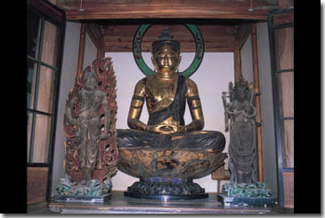 もと真言宗で遠松寺といい、南川の対岸の堂谷にありましたが、越前杣谷城主瓜生民部の娘が尼となって当寺へはいり文安元年ここに移し臨済宗の寺として再建、円照寺と改めたと伝えられています。本堂には本尊の大日如来座像、不動明王立像(重文)が安置されています。 木造大日如来坐像 平安時代、像高251.5cm。伝春日仏師作。堂々たる丈六像で、蓮華坐上に結果趺坐し、法界定印を結ぶ胎蔵界の大日如来像です。寄木造の像。平明穏やかに彫出されて、均整のとれた完好な像容が表出されていますが、通常の平安彫刻とは多少趣が異なるもので、どことなく新しい息吹が感じられます。四季うつりゆく禅寺に北陸随一・金色燦然の大日如来に接するとき、人はみな無我の境地に引き込まれます。 |