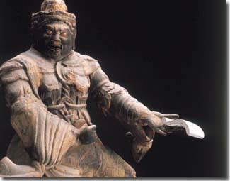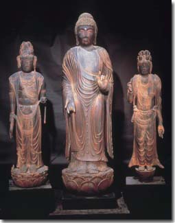 奈良・東大寺の二月堂への”お水送り”はこの神宮寺の神事として有名で、毎年3月2日に行われます。神体山を借景に若狭随一の木造本堂(重文)が雄大な景観を見せてくれます。力強い木造金剛力士像を安置した仁王門(北門)は重要文化財。 木造薬師如来立像 平安時代、像高192.5cm。台座を含む総高は219.9cm。多田寺の本尊。頭躰から台座までのほぼ全容を、1材から丸彫りしている完全な一木彫成像。手法からみて平安時代初頭の像とみられますが、本像には当時の一木彫成像特有の彫出がなされていないなど、通常の平安初期の像とは趣が異なります。新しい技法様式を求めて造像がなされていったとみられる像で、その点で奈良時代の神護寺(京都)薬師如来像と対比されることが多いです。眼病に霊験あらたかといわれています。若狭には穏やかな風土のもとに造られた地方作像が多いが、本像もその一つで、その中でも最も古い遺例です。 |