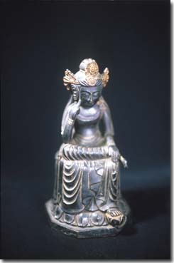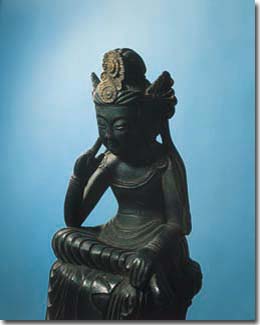 小浜市太良庄、正林庵。重要文化財指定(1918年4月8日)、奈良時代、像高31.6cm。奈良時代後期(白鳳時代)の像の特色をよく示しているもので、福井県における唯一の奈良時代前期の遺例です。このような半伽思惟像は古くは弥勒菩薩として造立されていたものが多く、如意輪観音とされたのは密教伝来以降のようであるので、本像も造立当時は弥勒菩薩として祀られていたものと思われます。鎌倉時代のころ若狭国太良庄は京都東寺の荘園でありましたが、寺の縁起によると、本像は仁治1年(1240)に、東寺よりこの太良庄に請来されたと伝えられています。 | |||